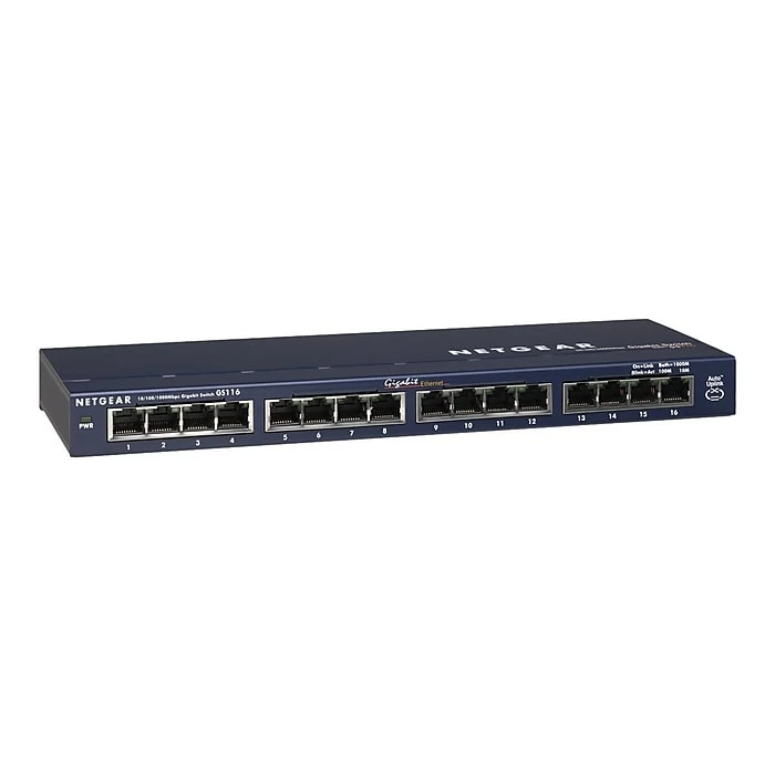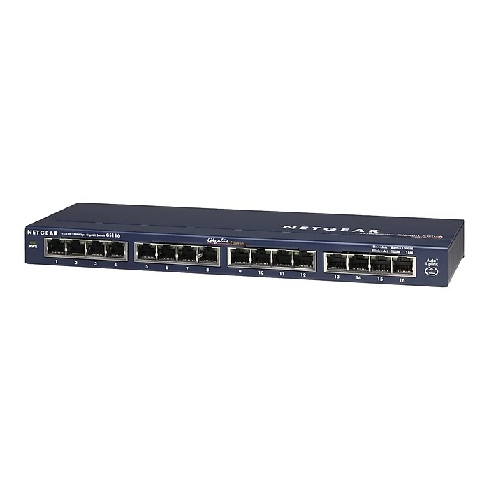 Now you can put together a powerful, high-speed network on a small scale. NETGEAR’s GS116 Copper Gigabit Ethernet Switch lets you build a system that can move even very large files across your network instantly — up to 2000Mbps on each port. The standards-based GS116 helps to protect customers’ existing and future network infrastructure investments by painlessly integrating other 10, 100, 1000 devices as well as honoring layer 2 802.1p priority tags. Packed with ease-of-use features, this adaptable switch supports either PC or Macintosh operating systems. The compact size makes it ideal for home, small office, workgroups, departments and conference room environments. Its durable metal case has no fan for silent operation.; Features; High-speed, auto-switching 10/100/1000Mbps Ethernet connection; Silently delivers up to 2000Mbps on each port; Integrates 10, 100, & 1000Mbps devices within a network; Honors Layer 2 802.1p traffic priority tags; Space-saving desktop dimensions; Package Contents;16-port Gigabit Switch GS116;Wall-mount kit; AC adapter; Installation guide; Warranty/Support information card
