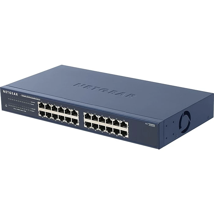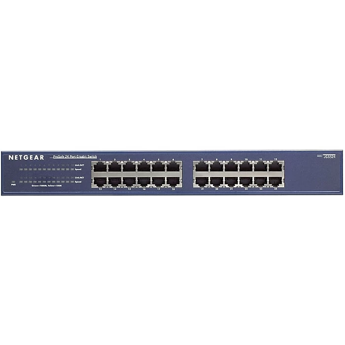 NETGEAR’s unmanaged JGS524 switch makes it affordable to take Gigabit to the desktop. This unmanaged 10/100/1000 Gigabit Ethernet switch provides high-speed connectivity for small office networks at an economical price a savvy business owner can’t ignore. All 24 switched 10/100/1000 ports deliver up to 2000Mbps throughput, up to 48Gbps of backplane bandwidth, and Auto Uplink technology to adjust for straight-through or crossover cables. This high-performance switch can combine 10, 100 and 1000Mbps devices within a network, and is conveniently compact for either the desktop or rack mounting. Ideal for work groups, departments or any small network looking for the ultra fast desktop connections.;Features;24 10/100/1000 ports; Powerful, non-blocking backplane; Affordable enough for desktop connections; Flexible Auto Uplink Technology makes the right link; Rack mount kit included; Package Contents;24-port Gigabit Ethernet Switch JGS524;Power adapter; Installation guide; Rack-mount kit; Warranty/Support information card