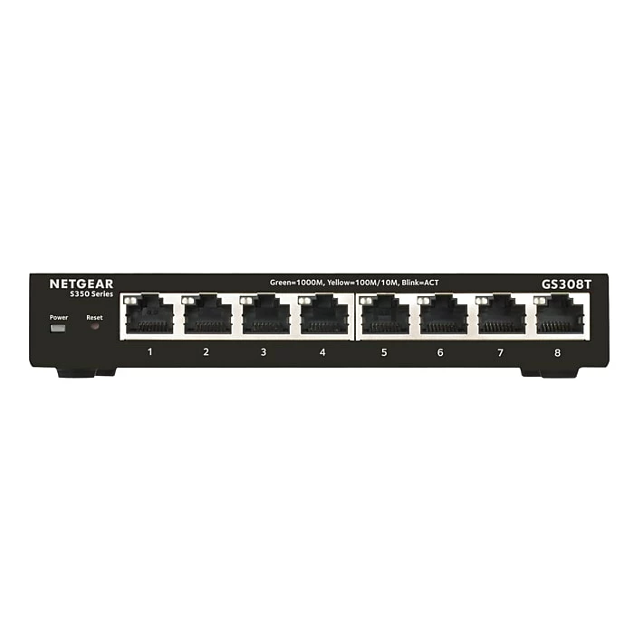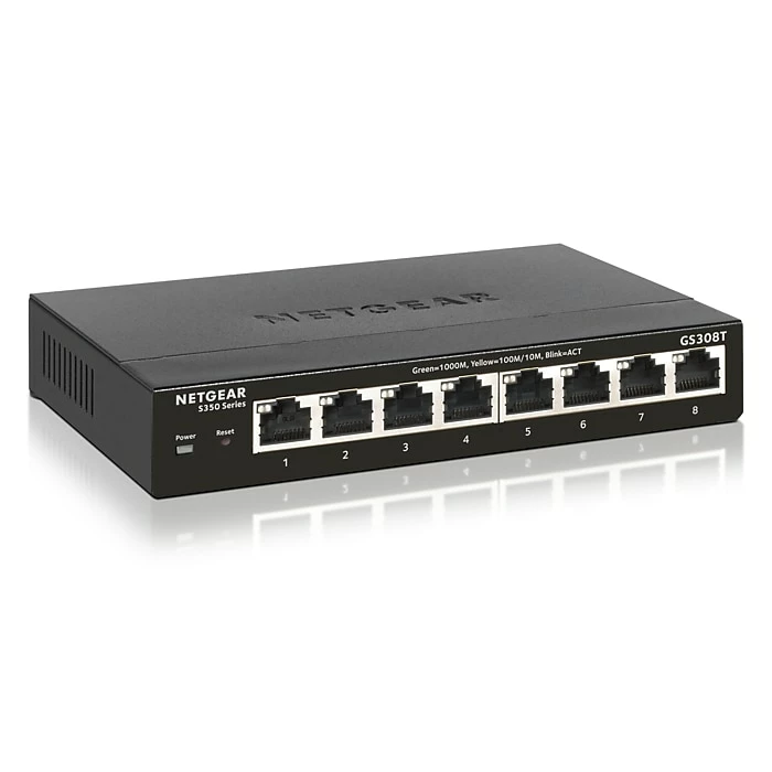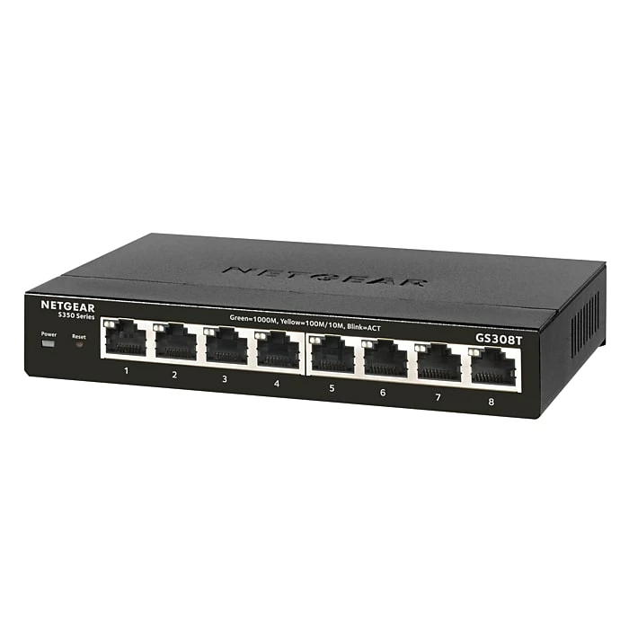 The NETGEAR GS308T S350 Series Smart Desktop Switch features 8-Port Gigabit Ethernet, fanless housing for quiet operation, and more.