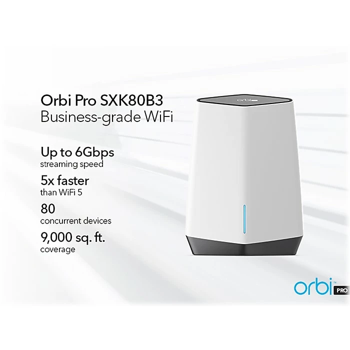 Cover up to 9,000 sq. ft. with the latest, ultimate business-grade Wi-Fi. The Orbi Pro Wi-Fi 6 tri-band Wi-Fi system provides unparalleled coverage, speed, and capacity to boost business productivity.
