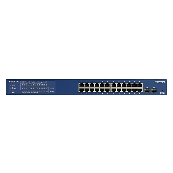 The NETGEAR GS724TP Smart PoE Switch is designed for desktop or rackmount and features 24-Ports of Gigabit Ethernet, 24 x PoE+ ports with a 190 watt budget, 2 x 1G SFP ports, ProSAFE Lifetime Protection and more.