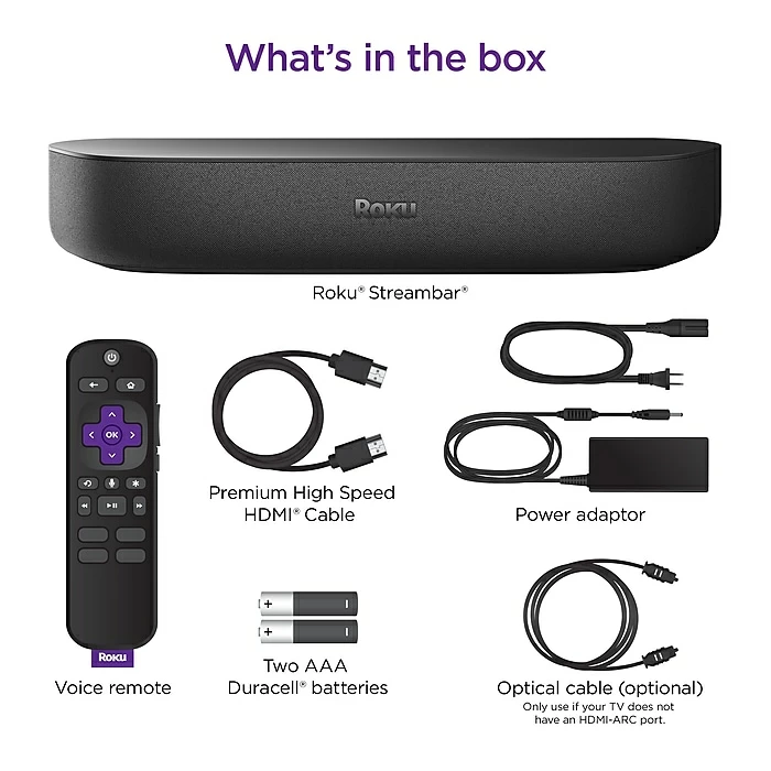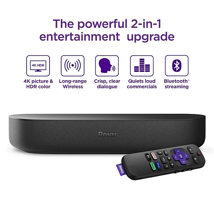 Roku Streambar is the ultimate 2-in-1 entertainment upgrade with powerful streaming and premium sound for any TV. Hear every detail as you stream the newest and most popular channels in vibrant 4K HDR picture quality. Crisp, clean audio makes dialogue easier to hear and with its compact design, you’ll be amazed at how something so small can fill your room with sound. You can even quiet loud commercials automatically, plus stream your favorite music and more with Bluetooth®. Setup is simple with everything you need in the box, including the Roku voice remote that controls your TV, sound, and streaming. Roku Streambar also works with popular voice assistants. Ask your Alexa or Google Assistant-enabled device to launch channels, search for entertainment, control your streaming, and more. Plus, it’s easily expandable for even bigger sound. Add deep, rich bass with Roku Wireless Subwoofer and immersive surround sound with Roku Wireless Speakers (sold separately). There’s no need to run cables across your living room. Just plug in these speakers and subwoofer and wirelessly pair them for even better sound.
