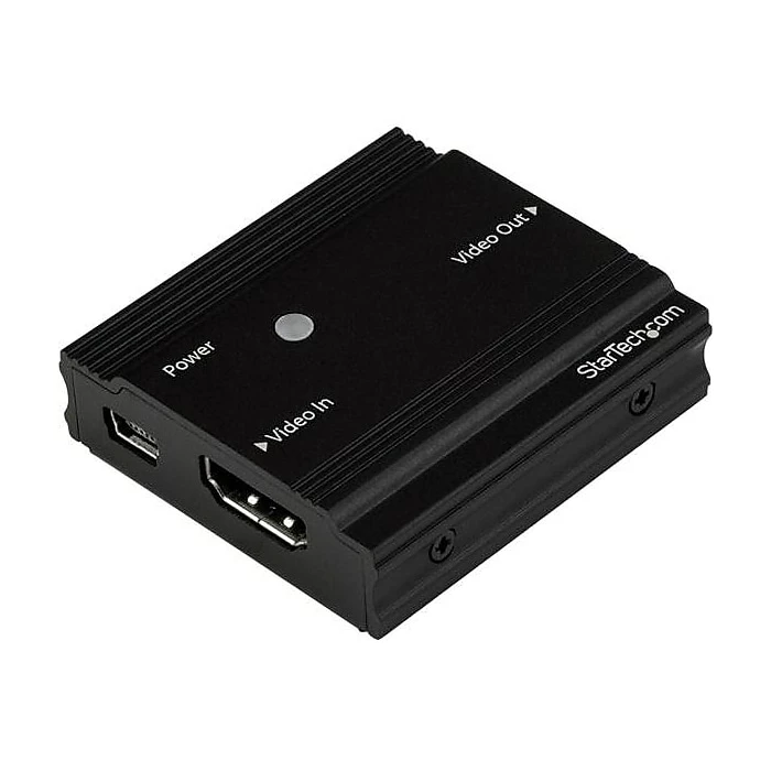 Use this repeater to amplify your 4K HDMI signal and extend it 30 ft. using a standard HDMI cable. This 4K HDMI® signal booster lets you increase the signal strength of your HDMI video source so it can travel greater distances using standard HDMI cables. You can achieve resolutions up to 4K at 60Hz at distances of up to 30 ft. (10 m), and depending on your desired resolution, the booster supports distances up to 115 ft. (35 m) away at 1080p 60Hz resolution.To install the booster, place it between two HDMI cables. Reference the table below for supported resolutions and cable lengths. Cable length from source Cable length to display Total cable length Maximum resolution 50 ft. (15 m) 65 ft. (20 m) 115 ft. (35 m) 1080p (60 Hz) – 1920×1080 32 ft. (10 m) 50 ft. (15 m) 82 ft. (25 m) 4K (30 Hz) – 3840×2160 15 ft. (5 m) 15 ft. (5 m) 30 ft. (10 m) 4K (60 Hz) – 3840×2160 Maintains Ultra HD 4K video signals at 60HzWhen you’re extending HDMI over distances using standard video cabling, higher resolutions from your HDMI 2.0 devices can become unavailable after a few feet. Using this HDMI signal booster ensures that HDMI 2.0 resolutions up to UHD 4K at 60Hz are available even at distances up to 30 ft. (10 m).You can achieve even longer distances at lower resolutions – up to 4K at 30Hz, at up to 82 ft. (25 m), and 1080p at 60Hz at up to 115 ft. (35 m).Easy and discreet installationWith its small form factor design and no external power adapter, the HDMI booster is easy to hide, for a discreet installation. By extending your video signal using standard HDMI cables, the 4K booster is a cost-effective alternative to more expensive extension systems that require the installation of a CAT5 or CAT6 cabling infrastructure.Supports a variety of distancesThe booster makes it easy to adjust your HDMI signal strength based on the distance of your cables, with equalization adjustment buttons. This means that you can adjust the amplification of your HDMI signal, to ensure your signal will be flawless.Support for a variety of extension distances makes the booster perfect for multi-device deployment across large institutions, such as boardrooms in corporate offices, classrooms in schools, or waiting rooms in hospitals, as these applications may require varied distances in different rooms.Note: To achieve resolutions up to 4K60, your video source, display and cabling must support HDMI 2.0.The HDBOOST4K is backed by a 2-year StarTech.com warranty and free lifetime technical support.