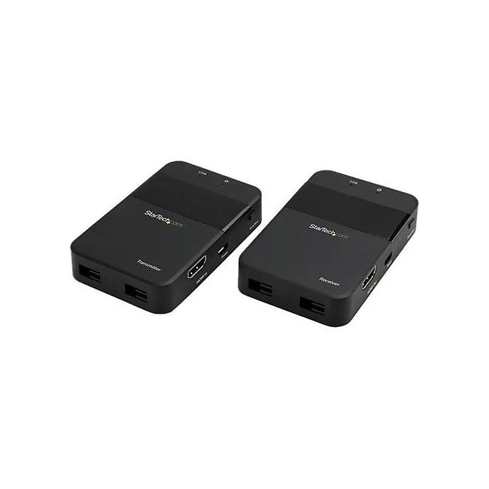This HDMI over wireless extender kit lets you extend your HDMI video signal wirelessly to a remote location, up to 65 ft (20m) away. You can extend or mirror your laptop computer to share uncompressed video, documents, music, and pictures in full HD. This wireless extender is the perfect solution for sharing ideas with your colleagues on a boardroom display or projector. Cut the cord with wireless video that’s easy to installWireless video is a practical alternative to traditional copper video cabling. It helps control your budget by avoiding the cost of installing an expensive wiring infrastructure. Plus, you don’t need to drill through your walls. The wireless video extender is easy to install and use, with simple plug-and-play installation. Just connect the video cables and turn on the extender. A pure hardware solution that doesn’t require any software or drivers, the bundled kit includes both the transmitter and receiver. It saves you the hassle and expense of buying multiple devices to accomplish one task. Hassle-free wireless video, with no compromisesThe extender is perfect for short range line-of-sight applications, enabling you to install your display wherever you want, unlike wired solutions that force you to compromise on the location of your display, based on the available cabling. The included hook-and-loop mounting strips also let you mount the extender and receiver to virtually any surface, such as walls or even the back of your display. With hassle-free operation, you don’t need to be an A/V technician to use this extender. It’s a great solution for commercial markets such as retail storefronts and lobbies, as well as healthcare and education facilities. Fast and secure HD performanceWith support for high definition resolutions up to 1080p, this HDMI over wireless extender can accommodate virtually any remote video application. The wireless extender transmits at 60 Hz enabling you to extend your 7.1 audio and video to a remote location with less than 100 milliseconds of latency, making this extender suitable for interactive applications, such as video games. To keep your video transmission secure, the extender uses AES-128 encryption. Note: For optimal performance the transmitter and receiver should be in sight of each other. The ST121WHDS is backed by a 2-year StarTech.com warranty and free lifetime technical support.