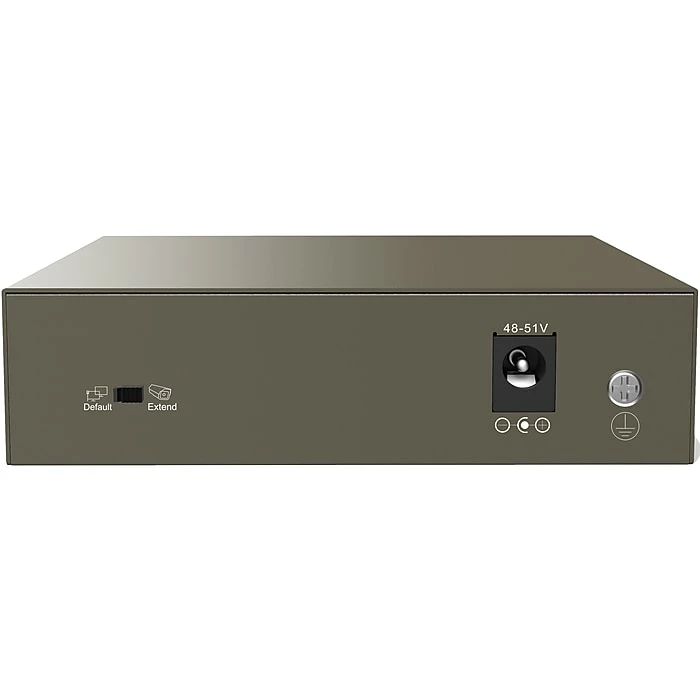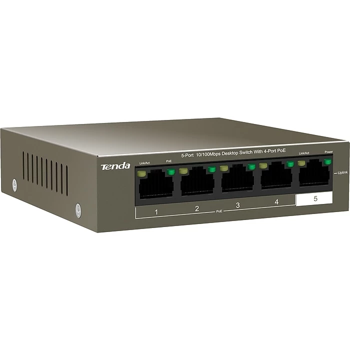 - Switch has four 10/100Mbps RJ45 ports (Data/PoE), one 10/100Mbps RJ45 ports (Data)