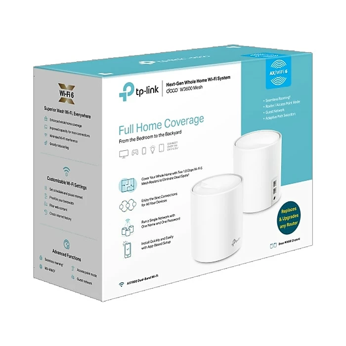 Armed with Wi-Fi 6 technology, the TP-LINK Deco W3600 whole-home mesh Wi-Fi is designed to deliver a huge boost in coverage, speed, and total capacity. With clearer and stronger signals enhanced by BSS color and beamforming, the Deco W3600 two-pack boosts broader whole-home Wi-Fi up to 4000 sq. ft. TP-LINK mesh means Deco units work together to form one unified network. Your phone or tablet automatically connects to the fastest Deco as you move through your home, creating a truly seamless Wi-Fi experience. Enjoy a more efficient network with way more average throughput on connected devices in dense environments thanks to the Wi-Fi 6 technology. Deco W3600 is tested to connect over 150 devices without dragging down performance. The advanced 1024-QAM and higher symbol rates work together to boost speeds up to 1.8Gbps, which is perfect for bandwidth-intensive tasks like cloud gaming and 4K UHD video. Families will enjoy immersive livestreaming with flawless video and clear audio without buffering.