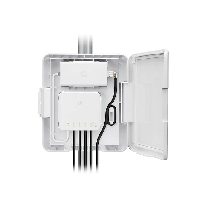 The USW Flex Utility is an outdoor weatherproof enclosure designed for use with the UniFi Switch Flex, USW-Flex. It includes an Ethernet patch cable and a 60W PoE adapter, which provides a maximum PoE budget of 46W. The USW Flex Utility can be easily mounted on a pole, provides clean cable management and screw lock for security.
