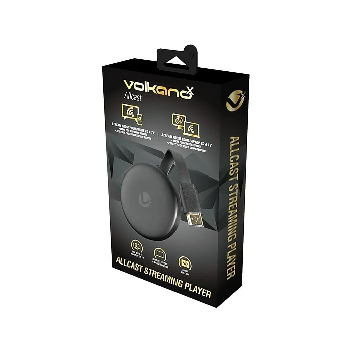 With the Volkano Allcast, you can cast and stream from any phone or laptop to a TV, monitor, or projector. Plug the Allcast into the HDMI port on your TV and to USB power, and stream your favorite entertainment right from your phone with just a tap; watch shows, listen to playlists, and more. It works with all of the streaming apps you know and love; enjoy TV shows, movies, videos, songs, games, sports, and more from apps like Netflix and YouTube. Mirror your phone’s display to a large screen. Extend your computer display, or drag Windows from your PC or Mac to your big screen for meetings, entertainment, or even just for an extra display.